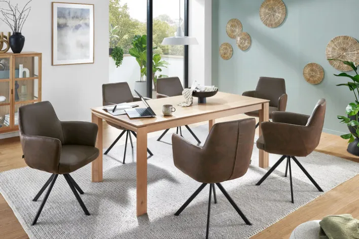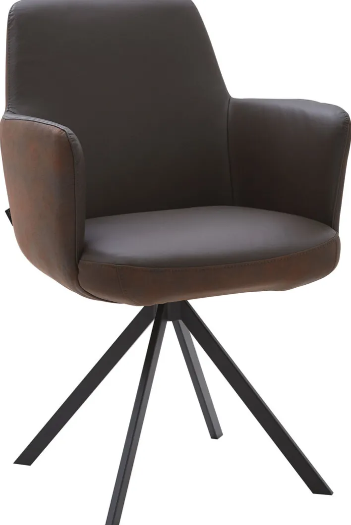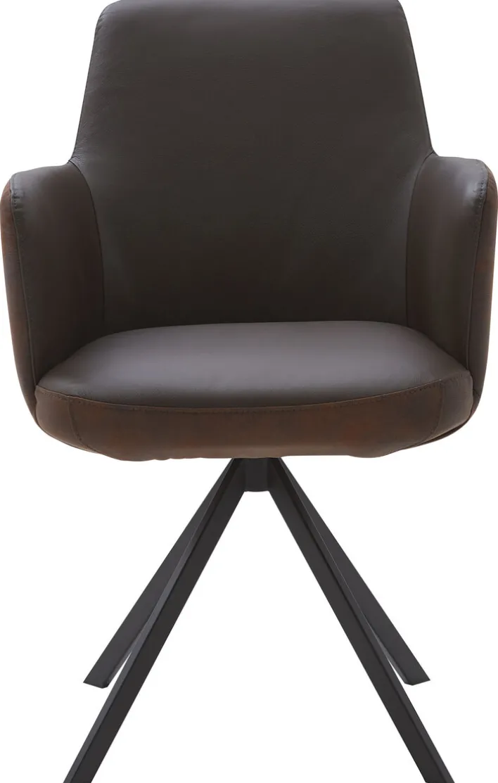 Der CASAVANTI Armlehnstuhl VERONA II vereint sein schwarz pulverbeschichtetes Spinnengestell aus Metall mit einem komfortabel gepolsterten Sitz. Dieser ist auf der Innenseite mit Echtleder bezogen, während die äußere Seite mit einem Textilbezug gestaltet ist. Der Stuhl lässt sich mit einem Gewicht von maximal 120 kg belasten und ist somit sehr robust. Ein weiteres Highlight ist seine 360°-Drehfunktion, die gemeinsam mit den Armlehnen das Aufstehen vom Tisch erleichtert.