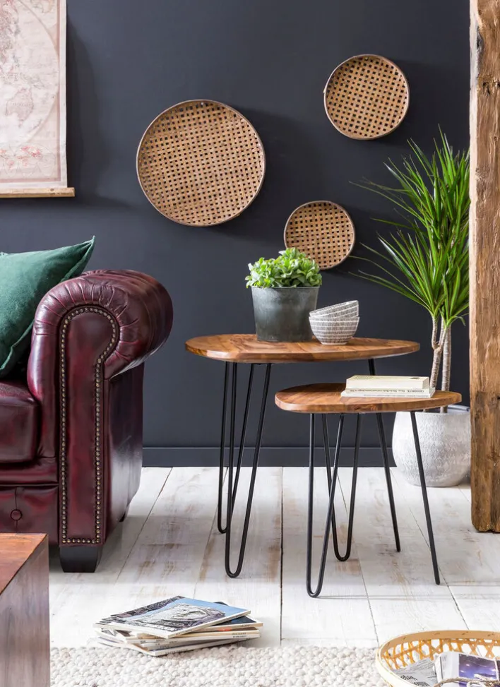 Die Tischplatte besteht aus massivem Holz (Rosenholz Sheesham) und zeigt eine angenehm lebhafte Maserung. Das filigrane Gestell ist aus Eisen gefertigt. Die Beistelltische können einzeln an verschiedenen Stellen platziert werden. Sie sehen aber auch sehr attraktiv aus, wenn der kleinere ein wenig unter den höheren geschoben wird. Beliebte Standorte sind der Stellplatz neben dem Lieblingssessel oder der Couch.
