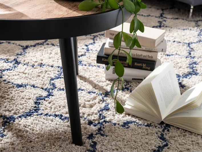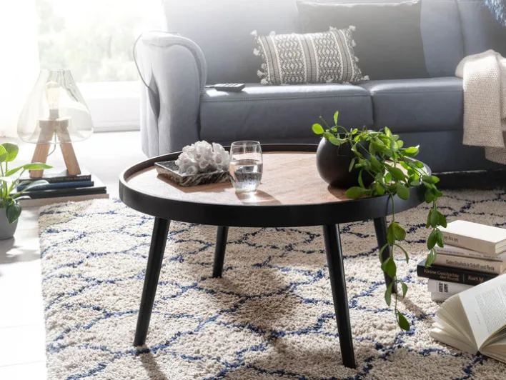 Das Vierfußgestell des Tisches ist wie die hohe Einfassung der Tischplatte in dunklem Schwarz gestaltet. Die runde Ablage aus mit Melaminharz kombinierter mitteldichter Faserplatte überzeugt in der beliebten matten Dekorfarbe Eiche. Die Oberflächen des Modells sind lackiert, sodass dieser sechs Kilogramm leichte Couchtisch, der einer Belastung von bis zu zehn Kilogramm standhält, leicht zu pflegen ist.