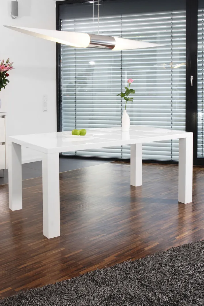 Die stabile Tischplatte und das Vierfußgestell des Esstischs ist aus hochwertig verarbeiteten MDF-Platten hergestellt. Die glatten Oberflächen und Kanten sind aufwendig lackiert und dadurch strapazierfähig. Der Esstisch ist für den Innenbereich geeignet.