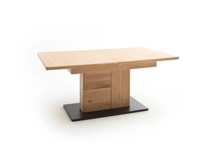Seine moderne Anmutung verdankt der CASAVANTI Esstisch BARCELONA dem Säulengestell aus teilmassivem Eichenholz, das auf einer Platte anthrazitfarbenen Platte ruht. Die klassisch rechteckige Tischplatte ist mit einem Säulenauszug mit innenliegender Einlegeplatte ausgestattet und passt sich flexibel an die Anzahl der Gäste an. Dank der natürlichen Holzmaserung wirkt die Tischplatte auch ohne Tischdecke äußerst elegant und lässt sich nach Belieben dekorieren. Zur stilvollen Ergänzung fürs Esszimmer empfehlen sich weitere Holzmöbel aus der BARCELONA-Serie von CASAVANTI.