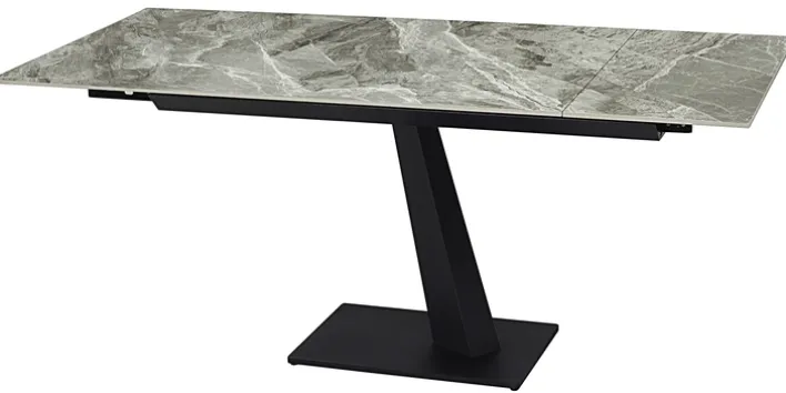 Der Esstisch NENA besticht mit seinem eleganten Look mit einer hellgrau marmorierten Tischplatte aus gesintertem Stein. Die Platte wird von einem schwarzen Säulengestell aus Metall mit einer rechteckigen Bodenplatte getragen. Der Tisch misst 85 cm in der Breite, 76 cm in der Höhe und 140 cm in der Länge. Er lässt sich mit Hilfe des Kopfkulissenauszugs auf 180 cm ausziehen. So bietet er bequem Platz für vier bis sechs Personen.