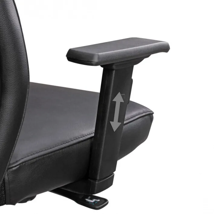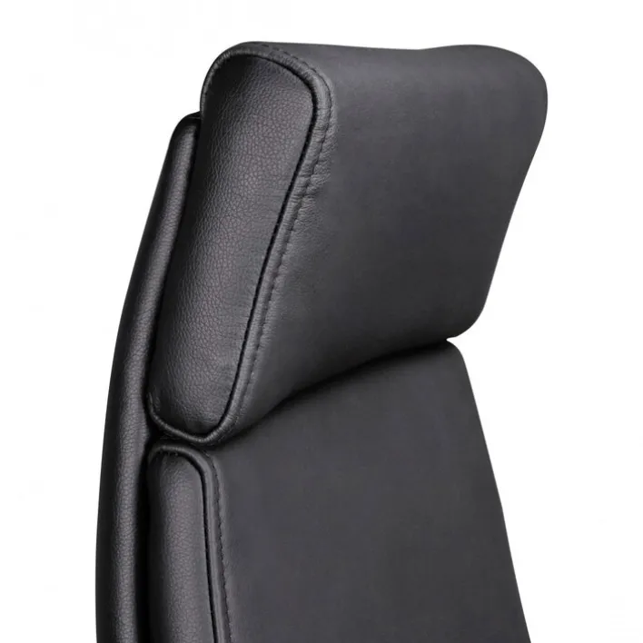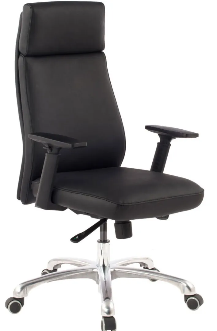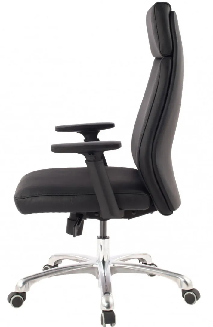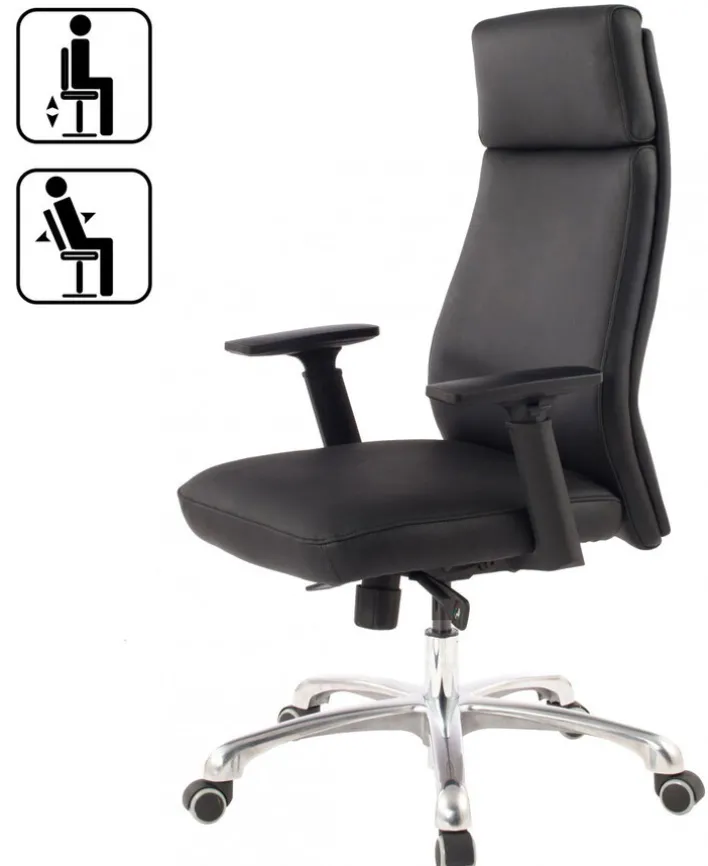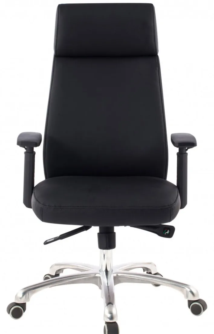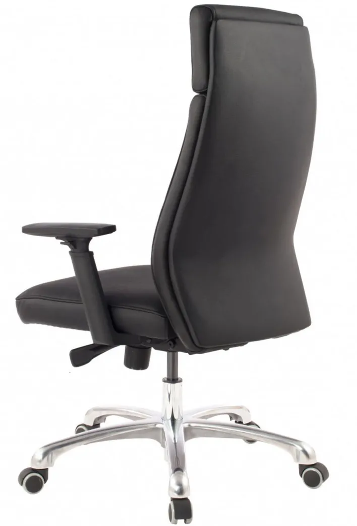 Der Chefsessel besteht aus einem Aluminium-Fußkreuz in Hochglanz-Optik mit robusten Doppelrollen und einem komfortabel gepolsterten Sitz mit schwarzem Lederbezug. Dank der ergonomisch geformten Rückenlehne bietet der Schreibtischsessel auch bei stundenlangem Sitzen ein komfortables Sitzgefühl. Zudem ist der Sessel von 107 -117 cm höhenverstellbar und er passt sich an jede Schreibtischhöhe an. Die Drehfunktion sorgt gemeinsam mit den Doppelrollen und den Armlehnen für ein bequemes Hinsetzen und Aufstehen.
