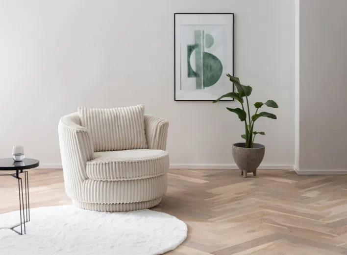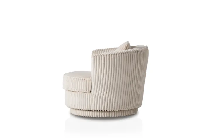 Der Cocktailsessel SPIN in elegantem Elfenbein hat einen Durchmesser von 95 cm. Dank seines ansprechenden Designs und dem hohen Sitzkomfort hat er gute Chancen, der neue Lieblingsplatz zu werden.