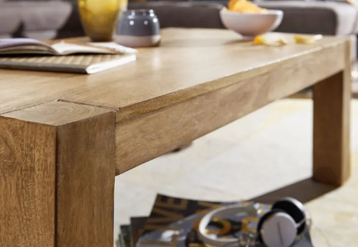 Der Couchtisch verbreitet eine warme und wohnliche Atmosphäre. Seine kantigen Füße und die robuste Platte strahlen Stabilität und Langlebigkeit aus. Gut kombinieren lässt sich der Tisch mit Möbeln in Holzoptik, aber auch mit Korbsesseln oder einem Ledersofa. Seine dekorative Optik kommt besonders gut zur Geltung, wenn sie sparsam dekoriert oder nur bei Bedarf als Ablage genutzt wird.