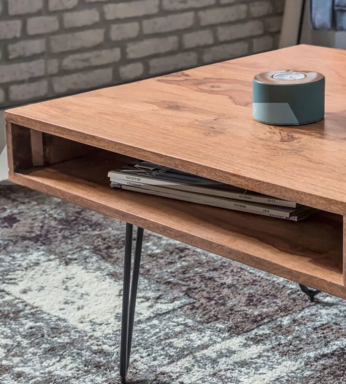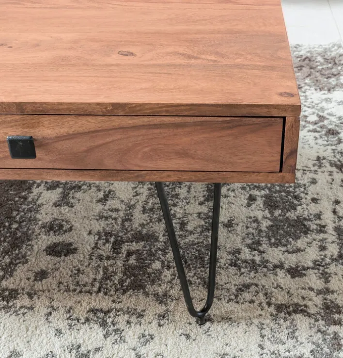 Der Couchtisch eignet sich hervorragend fürs Wohnzimmer und passt zu fast jeder Couch, ist aber auch in anderen Wohnbereichen ein echter Hingucker. Die dezente Schublade mit edlem Metallgriff und das schmale offene Fach verhindern, dass sich zu viel Krimskrams am Tisch ansammelt und dieser damit schön frei bleibt. Das Möbelstück ist handgearbeitet und wird von einem Vierfußgestell aus schwarzem Metall getragen.
