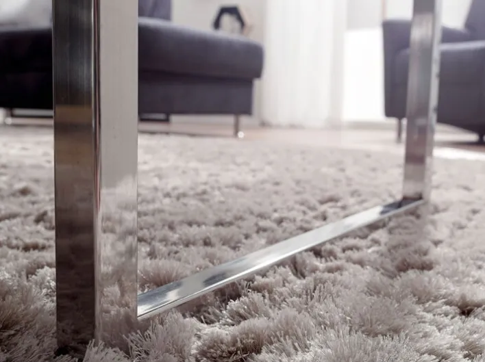 Der schmale und überlange Couchtisch besticht mit seiner Kombination aus warmem Holz und kühlem Metall. Die Tischplatte besteht aus edlem Sheesham, einem edlen indischen Edelholz. Die hochwertige Verarbeitung bringt die natürliche Maserung des Holzes besonders gut zur Geltung. Leichtigkeit erhält die massive Tischplatte dank der schlanken, chromfarbigen Kufenfüße. Der Tisch ist in Handarbeit gefertigt und ebenso mit einer Platte aus hellerem Akazienholz erhältlich.