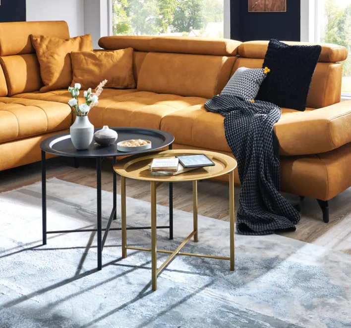 Der zweiteilige runde Couchtisch aus Metall in Schwarz/Goldfarbig stellt eindrucksvoll unter Beweis, dass die schönen Dinge im Leben manchmal direkt im Zweierpack kommen. Die beiden Tische ergänzen sich, wenig überraschend, in Perfektion zueinander: Wobei der goldfarbige Tisch etwas kleiner ist, weshalb er teilweise versetzt unter dem größeren Tisch platziert werden kann.