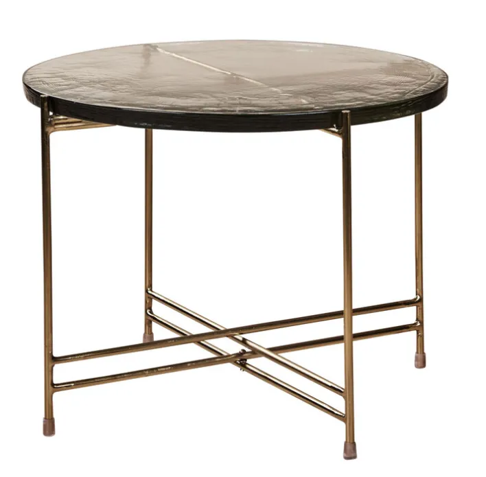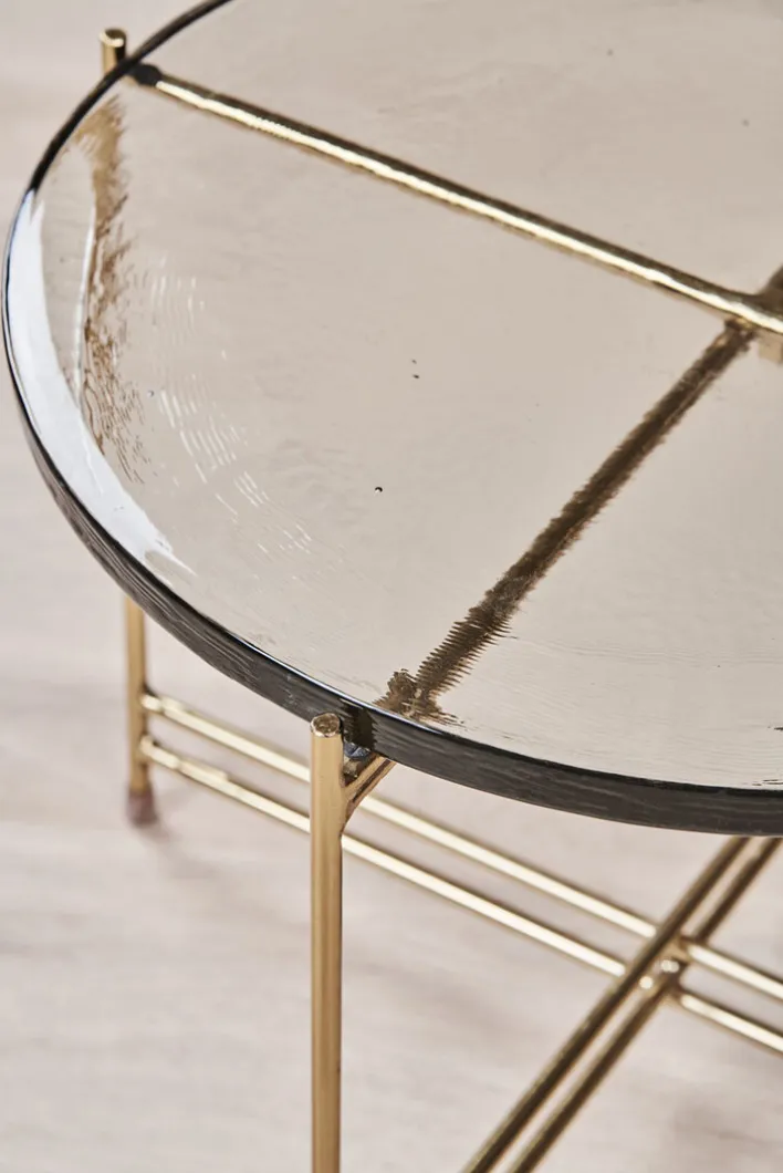 Dieser runde Couchtisch besitzt einen Durchmesser von 50 cm und eine Höhe von 45 cm. Er besteht aus Casted Glass Clear bei der Tischplatte (einem besonderen, transparenten Glas) sowie einem Kreuzgestell aus goldfarbig lackiertem Eisen in Hochglanz.