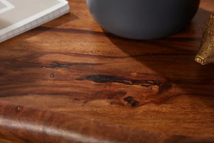 Vor einer Sofalandschaft oder vor einer Couch macht der Couchtisch von nicht nur ein gutes Bild, sondern ist auch sehr praktisch. Auf der Fläche von 71 x 40 cm finden Gläser, Fernbedienung und andere Dinge Platz. Der hochgezogene Rand der Platte, die aus massivem Sheesham und Rosenholz gefertigt ist, sorgt für eine sichere Ablage. Die braune Beize betont die Holzmaserung.