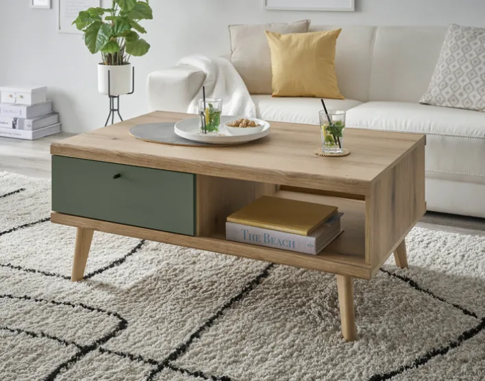 Seine schlichte Formensprache verleiht dem Couchtisch ALVA eine moderne Eleganz. Dezente Metallgriffe an den grünen Fronten der Schubkästen fügen sich harmonisch ins Gesamtbild ein und unterstreichen die zeitgemäße Ausstrahlung. Das offene Fach, die Schubkästen und die große Ablagefläche bieten viel Platz für Bücher, Dekoration, Geschirr oder Fernbedienung. Der Couchtisch ALVA eignet sich ideal für ein minimalistisches, gemütliches Ambiente mit Vintage-Touch.