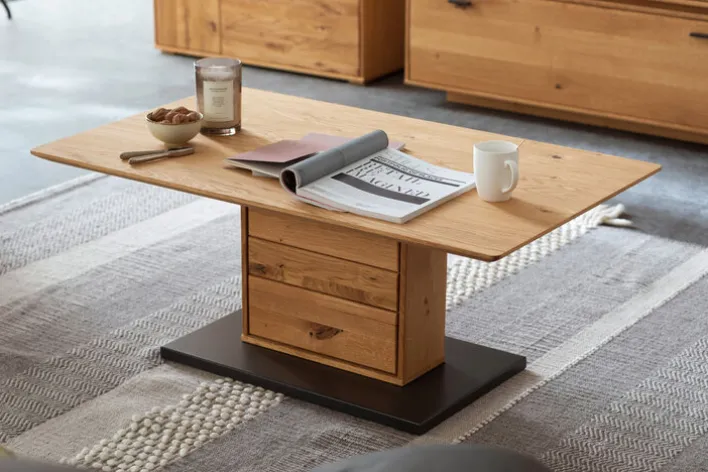 Bei diesem Tisch fällt zunächst die in Anthrazit lackierte Bodenplatte auf, die einen interessanten Kontrast zum braunen Eichenholz abgibt, dessen Oberflächenbeschichtung geölt ist. Auch, dass es sich bei der Gestellart um ein Säulengestell handelt, verleiht diesem Möbel, das eine Tiefe von 45 cm hat, einen einzigartigen Charakter. Auf der rechteckigen Tischplatte ist Platz für die Dinge, die gerade gebraucht werden, sei es die Fernsehzeitschrift für einen interessanten Filmabend oder aber die Karten beim geselligen Spieleabend mit Freunden.