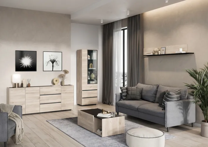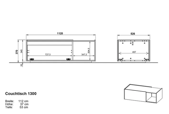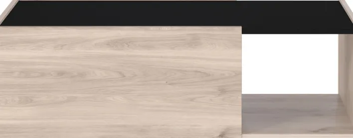 Das attraktive Möbel verfügt über 2 Klappen, jeweils eine auf der Vorder- und Rückseite. Dazu kommt 1 offenes Fach. Auch sind die beiden Klappen mit einer Soft-Close-Technik ausgestattet. Weiterhin zeichnet sich der Tisch durch ABS-Kanten aus. Seine Tiefe beträgt 53 cm. Dieser moderne Couchtisch mit seiner hellen Hauptfarbe und der schwarzen Ablage passt sowohl zu hellen Holzmöbeln als auch zu Sofas in Grau, Rot oder Schwarz.