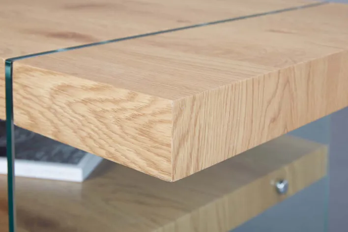 Der Couchtisch JUSTIN begeistert mit seinem modernen Design mit einem Mix aus Holz und Glas in rechteckiger Form. Das Fixgestell besteht aus transparentem Sicherheitsglas. Die Tischplatte ist in Holznachbildung aus mitteldichter Faserplatte (MDF) im hellbraunen Dekor von Wildeiche gefertigt. Der solide Tisch misst 110 cm in der Breite und 60 cm in der Tiefe bei einer Höhe von 45,5 cm. Das Gewicht liegt bei 26,6 kg.