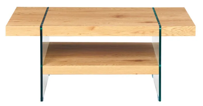 Eine Besonderheit dieses Couchtisches ist der Zwischenboden, der sich optisch an die Tischplatte in einem Dekor aus Wildeiche anlehnt. Er bietet viel praktische Ablagefläche für Nützliches wie Fernbedienung und Zeitschriften.