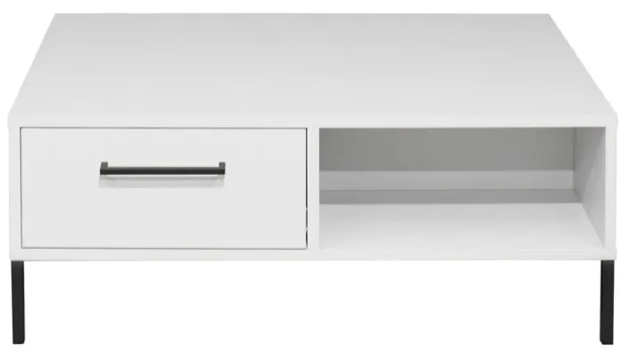 Der Couchtisch präsentiert sich in einem klassischen Design mit einer rechteckigen Form und einer eleganten weißen Mattlack-Oberfläche. Die Maße betragen 100 cm in der Breite, 35 cm in der Höhe und 70 cm in der Länge, was ihn zu einer idealen Ergänzung für jedes Wohnzimmer macht. Der Tisch verfügt über zwei Schubkästen und zwei offene Fächer, die ausreichend Stauraum für Zeitschriften, Fernbedienungen und andere Alltagsgegenstände bieten.