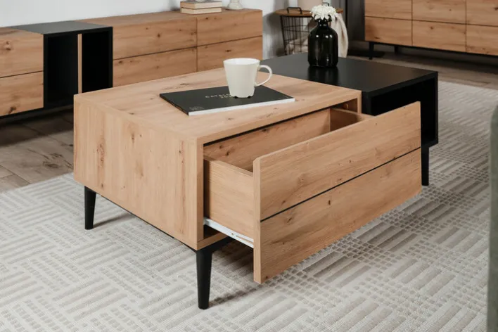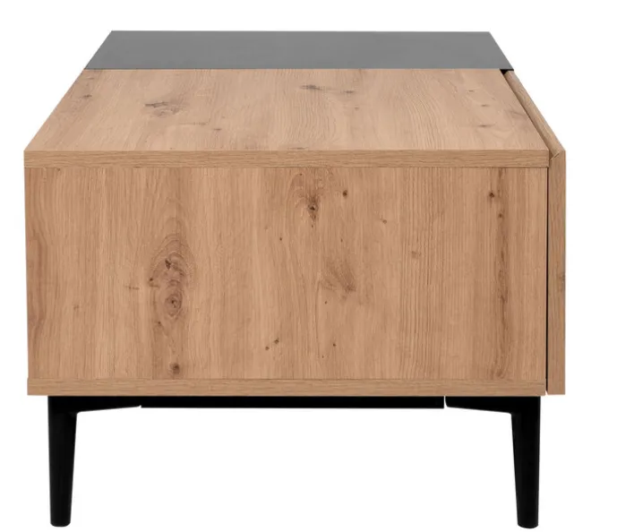 Bei Couchtisch NOLA ist ein Dekor in warmer Holzoptik mit klassischem Schwarz kombiniert. In dem großen offenen Fach lassen sich ganz nach Belieben hübsche Accessoires, dekorative Getränkeflaschen oder Unterhaltungsmedien aufbewahren. Die geräumige Schublade versteckt alles, was nicht auf den ersten Blick sichtbar sein soll.