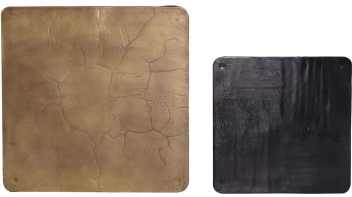 Die Couchtische SETH kombinieren das schwarze Metallgestell mit Tischplatten aus Metall in edlem Antik-Design. Die Farben harmonieren perfekt und lassen sich mit modernen und klassischen Möbeln kombinieren. Durch die wunderschönen Oberflächen und die unterschiedlichen Höhen bieten die zwei Tische einen spannenden Anblick. Natürlich müssen die Sofatische nicht in Kombination aufgestellt werden, auch einzeln ziehen sie alle Blicke auf sich. Neben dem ansprechenden Design überzeugen die Couchtische mit einer strapazierfähigen Oberfläche, die Platz für Snacks und Getränke bietet.