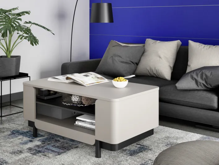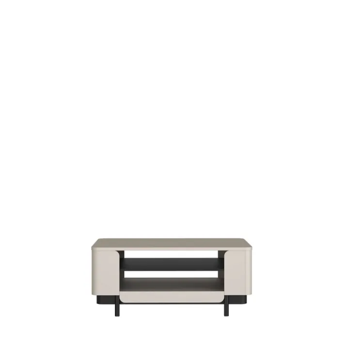 Der Couchtisch VODOL in der Farbe Sand und Schwarz überzeugt mit seinen geräumigen Maßen von 115 x 50 cm und seinem eleganten Aussehen mit den abgerundeten Kanten und den offenen Ablagefächern. Die beiden abgesetzten Farben sorgen für optische Akzente und passen sich hervorragend in die Wohnlandschaft ein.