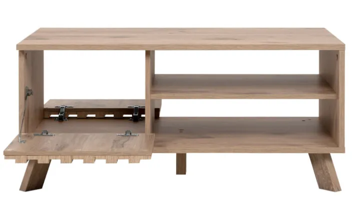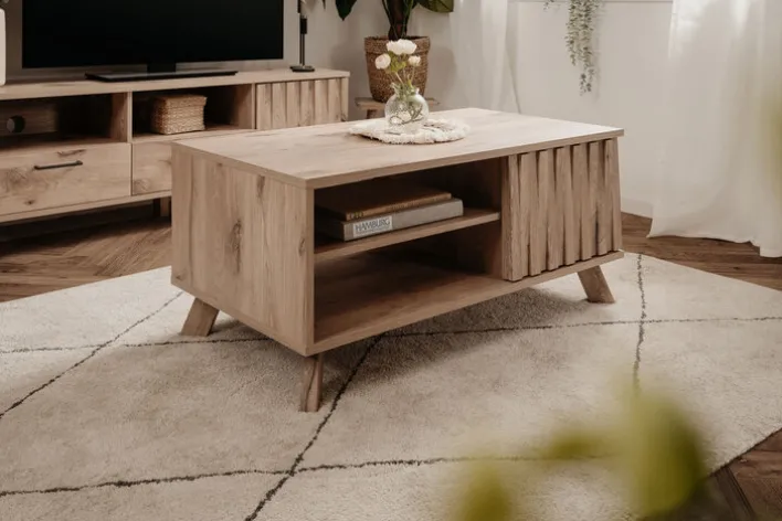 Mit seinem hellen Holzdesign und dem zeitgemäßen Charakter ergänzt sich der Couchtisch von QUARTIER gut zu einer Couchecke im skandinavischen Stil. Er ist gleichermaßen ein Hingucker in einem modern eingerichteten Wohnzimmer. Ein schöne Besonderheit ist das geriffelte Design der beiden Klapptüren, die viel Stauraum bieten.