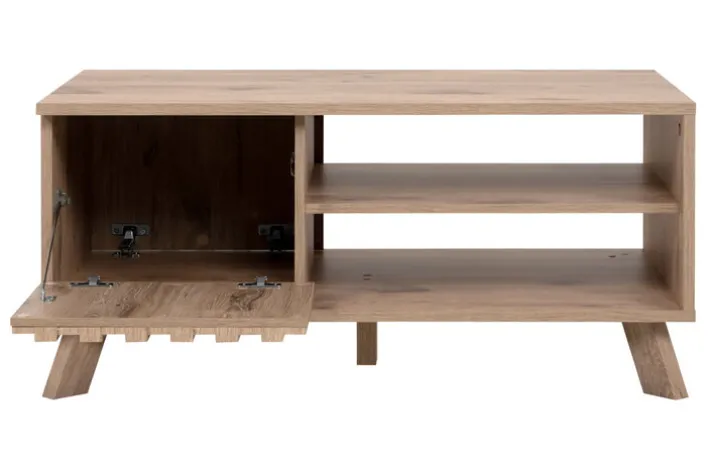 Der Couchtisch WELLINGTON ist aus Spanplatte in einer Holznachbildung im Design Schwedeneiche mit gleichfarbigen Füßen gefertigt. Er misst in der Breite 100 cm, in der Höhe 45 und in der Tiefe 55 cm. Der Couchtisch verfügt über zwei offene Fächer sowie ein Fach, das mit jeweils einer Klapptür von zwei Tischseiten aus geöffnet werden kann.