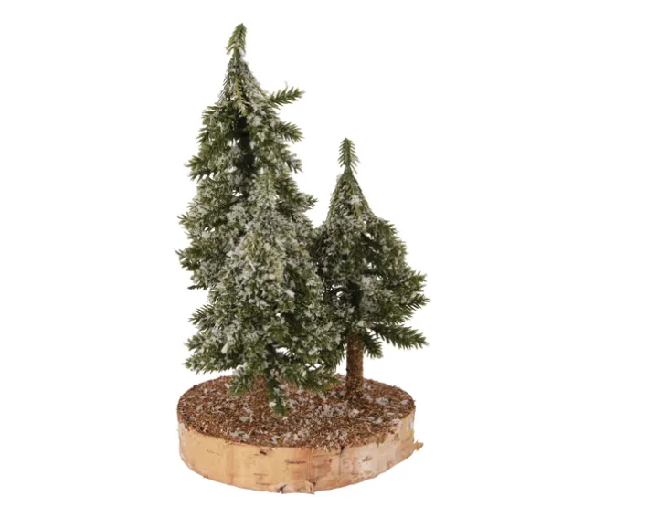 Dieses Deko Objekt besteht aus zwei detailgetreu gestalteten Tannenbäumen aus grünem Kunststoff, die auf einer runden, naturfarbenen Holzscheibe befestigt sind. Die Oberfläche der Bäume ist mit einer feinen, weißen Schneeschicht versehen, was dem Arrangement eine winterliche Optik verleiht. Die Maße betragen 13 cm in Breite und Tiefe sowie 23 cm in der Höhe, der Durchmesser entspricht ebenfalls 13 cm. Das Produkt ist für den Innenbereich geeignet und kombiniert die Farben Grün, Braun und Weiß.