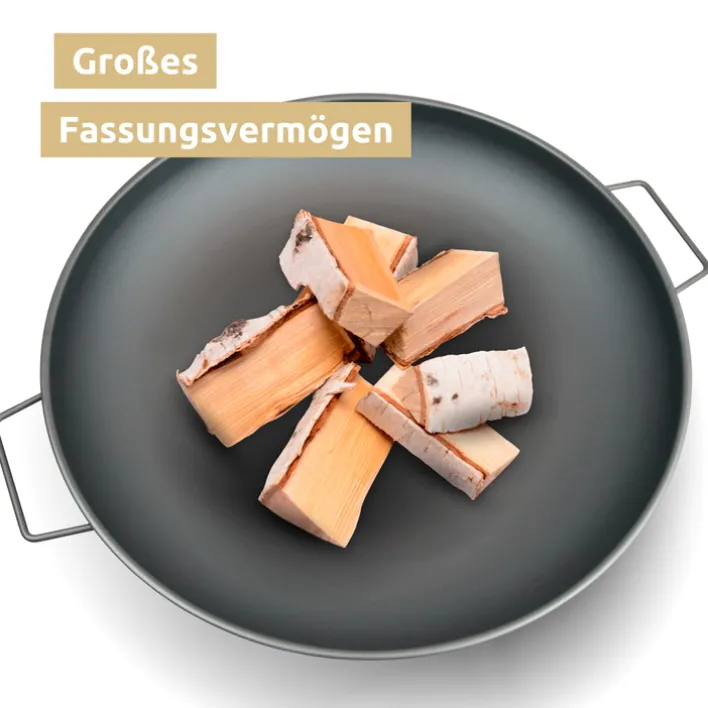 Diese schwarze Feuerschale aus robustem Stahl weist mit einem Durchmesser von 58 cm ein großes Fassungsvermögen auf. Zugleich handelt es sich um eine kompakte XL-Feuerstelle, die sich dank Tragegriffen leicht transportieren lässt.