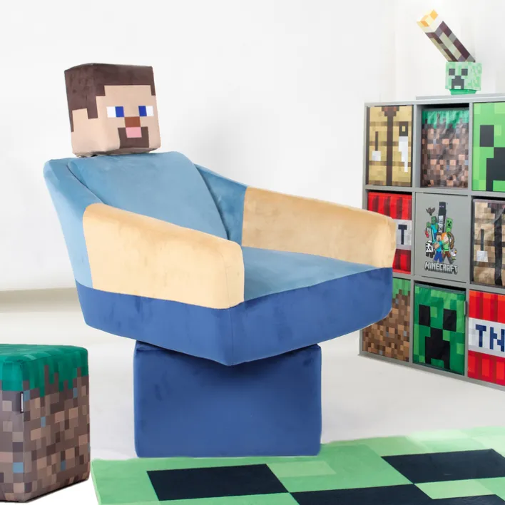 Der MINECRAFT Drehsessel Steve in Blau ist mit seiner extravaganten Form und Optik ein garantierter Hingucker in jedem Kinderzimmer, könnte genauso gut aber auch im Wohnzimmer von begeisternden Minecraft-Gamern stehen. Wie unschwer zu erkennen ist, nahm sich der Drehsessel den ikonischen Steve-Charakter aus dem Minecraft-Spiel zum Vorbild – und setzte den in einer typisch blockartigen Silhouette in Szene.