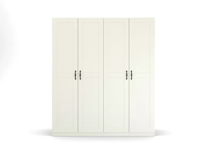 Der Drehtürenschrank aus der Serie CAMBRIDGE präsentiert sich im klassischen Landhausstil und ist in einem klaren Alpinweiß gehalten. Die vier Drehtüren verfügen über markante, dunkle Griffe, die einen dezenten Kontrast zur hellen Front bieten. Die Frontgestaltung ist durch eine ruhige, geradlinige Rahmenoptik geprägt, die dem Schrank eine zeitlose und gleichzeitig moderne Wirkung verleiht. Die Oberfläche des Schranks zeigt eine glatte, matte Struktur ohne sichtbare Maserung, was seinen schlichten Charakter unterstreicht.