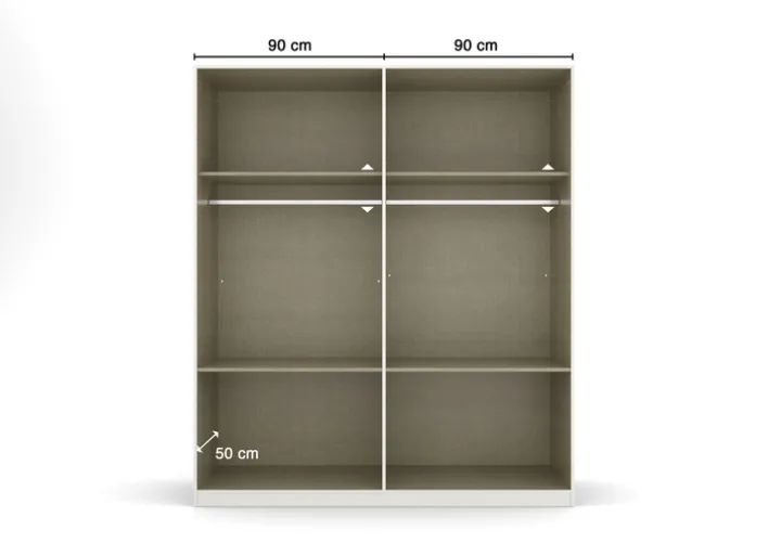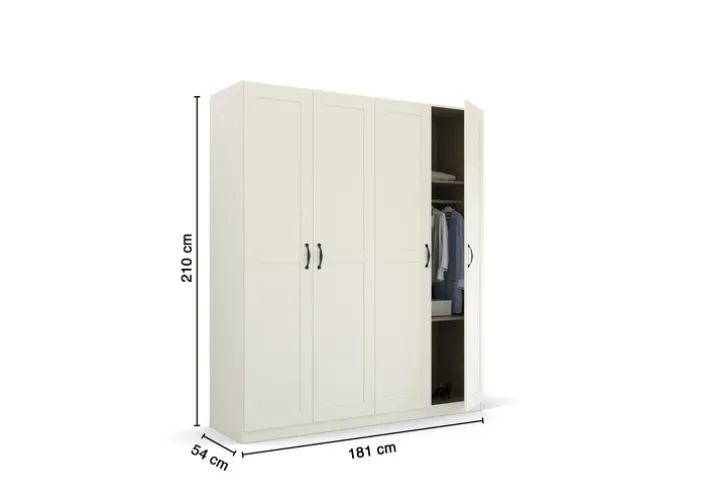 Mit einer Breite von 180 cm, einer Höhe von 210 cm und einer Tiefe von 54 cm bietet der Schrank großzügigen Stauraum, der durch zwei Kleiderstangen und vier Einlegeböden optimal nutzbar ist. Das Möbelstück besteht aus Holznachbildung und eignet sich vor allem für den Einsatz im Schlafzimmer. Die Konstruktion ist auf Funktionalität ausgelegt und ermöglicht eine übersichtliche Organisation der Kleidung und anderer Textilien.