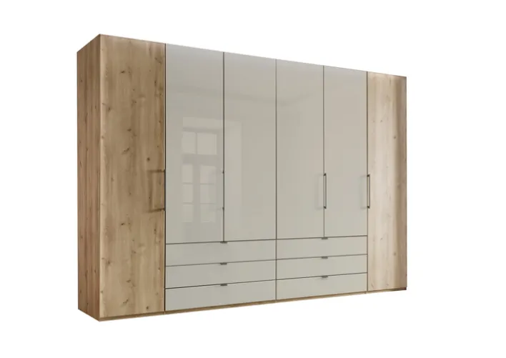 Der Schrank verfügt über sechs Drehtüren, die einen einfachen Zugang zum Inneren ermöglichen. Im Inneren befinden sich vier Kleiderstangen und acht Einlegeböden, die eine flexible Organisation der Kleidung erlauben. Zusätzlich bieten sechs Schubkästen weiteren Stauraum für kleinere Gegenstände. Die Soft-Close-Funktion sorgt für ein leises und sanftes Schließen der Türen und Schubladen. Gefertigt aus Holznachbildung und Glas, vereint der Schrank Langlebigkeit mit einem modernen Design.