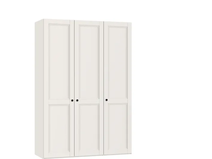 Der Drehtürenschrank aus der Serie „Longline Landhaus“ vereint Funktionalität und ästhetisches Design im Landhausstil. Mit einer Breite von 152 cm, einer Höhe von 220 cm und einer Tiefe von 58,5 cm bietet er großzügigen Stauraum. Der Schrank ist aus Holznachbildung gefertigt und in einem eleganten Cremeweiß gehalten, das sich harmonisch in verschiedene Wohnstile einfügt. Die drei Drehtüren sind mit schwarzen Griffen ausgestattet, die einen stilvollen Kontrast zur Hauptfarbe bilden.
