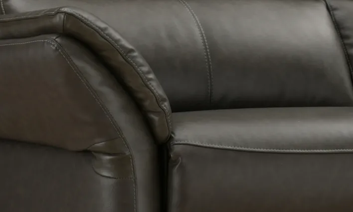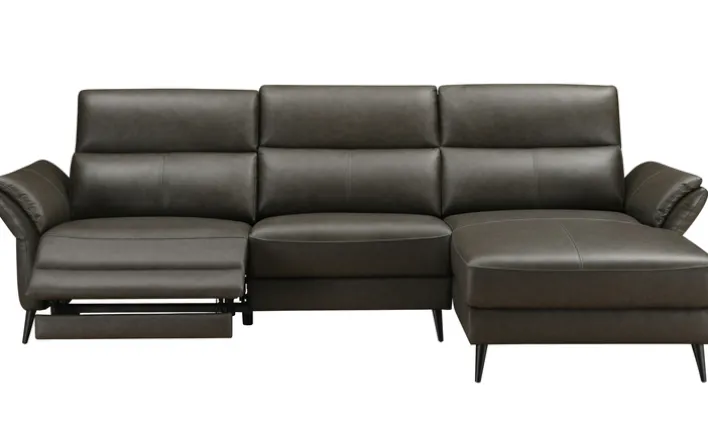 Das dunkelgraue Ecksofa SIMON hat eine elektrische Relaxfunktion. Geprägt ist dieses Möbelstück auch durch sein Design im Lederlook.