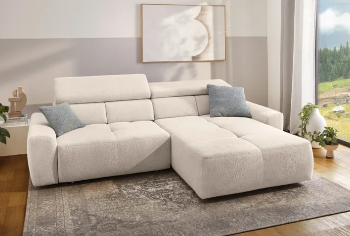 Das Ecksofa aus der Serie UNOS besticht durch sein modernes Design in Beige mit schwarzen Akzenten. Die großzügige Liegefläche von 160 x 243 cm und das Stellmaß von 299 x 211 cm bieten viel Platz für entspannte Stunden im Wohnzimmer. Die Oberfläche besteht aus strapazierfähigem Flachgewebe aus 100 % Polyester, das eine hohe Scheuerbeständigkeit von 60.000 aufweist. Zwei Zierkissen sind im Lieferumfang enthalten, die das Gesamtbild harmonisch ergänzen.