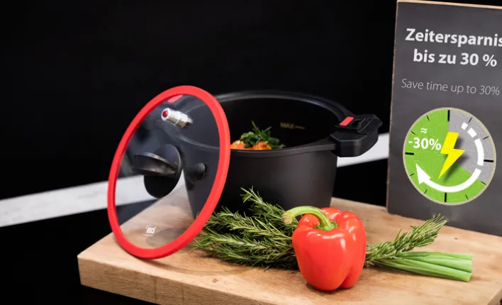 Der ELO Energiespartopf ist aus Aluminiumguss gefertigt und ist für alle Herdarten geeignet. Mit 6 Liter bietet er ausreichend Platz für eine Familienmahlzeit. Der Topf ist durch die hochwertige Antihaftversiegelung ideal für fettarmes und fettfreies Kochen. Zum Highlight wird der Energiespartopf allerdings durch den besonderen Glasdeckel. Dieser ist mit einem Druckablassventil für ständigen Druckausgleich ausgestattet und ermöglicht das Öffnen während des Kochvorgangs. Dieser Mechanismus ohne Überdruck spart Zeit und Energie.