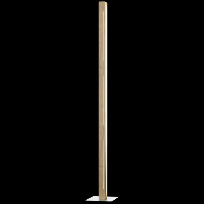 Der Schirm der Stehlampe ist aus braunfarbigem Holz gefertigt. Die Abdeckung für das festeingebaute Leuchtmittel besteht aus Kunststoff. Die stabile Bodenplatte der Stehlampe ist aus Metall in nickelfarbig und sorgt für einen sicheren Stand.