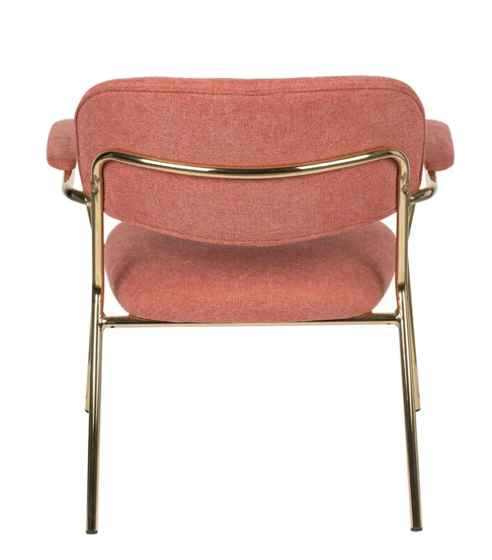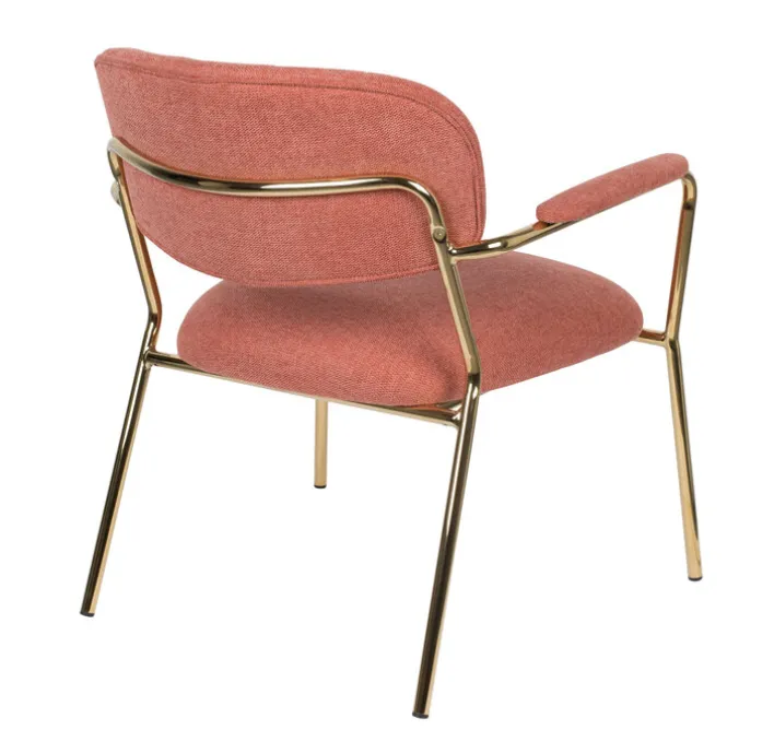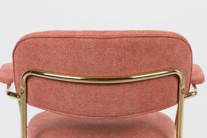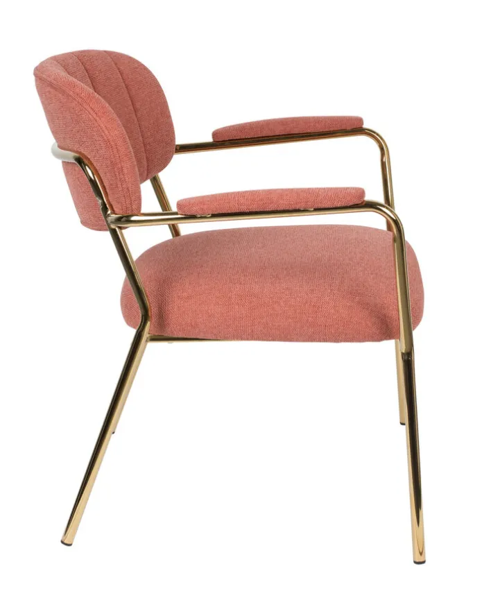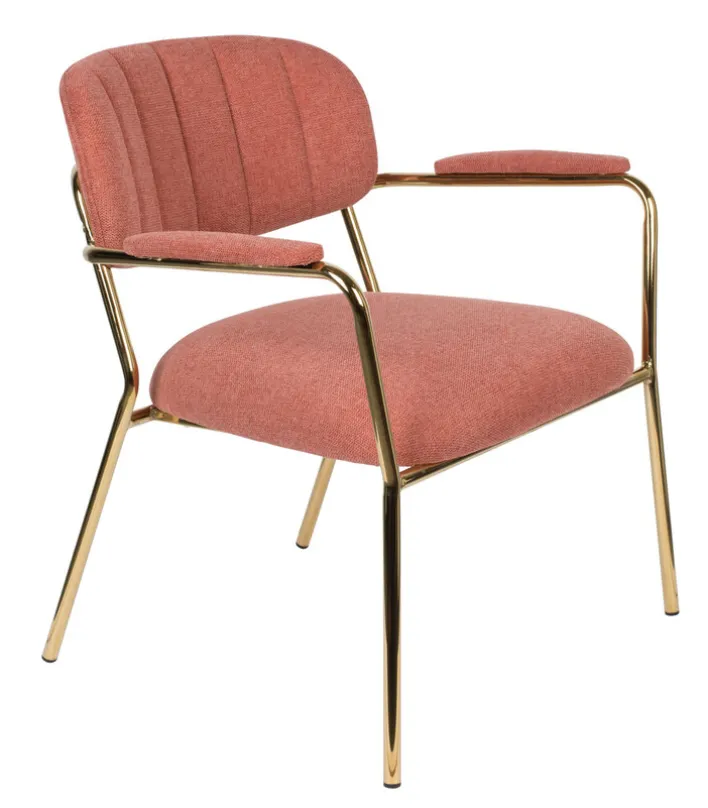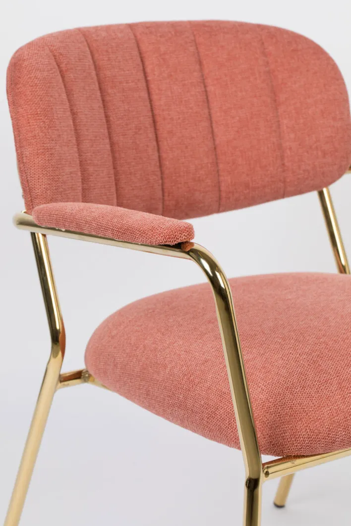 Der Esszimmerstuhl JOLIEN AL besteht aus einem Vierfußgestell aus pulverbeschichtetem Stahl in goldfarben und einem zweiteiligen Sitz mit strapazierfähigem Bezug aus 95% Polyester und 5% Nylon. Gepolstert mit PUR-Schaum ist der Esszimmerstuhl sehr bequem. Unterstrichen wird der Sitzkomfort von einer gebogenen Rückenlehen und den gepolsterten Armlehnen. Diese sind nicht nur beim Sitzen komfortabel, sondern erleichtern zudem das Aufstehen. Mit seinem trendigen Design ist der Esszimmerstuhl die ideale Wahl für moderne Esszimmer und offene Wohn-Essbereiche im angesagten Look.“