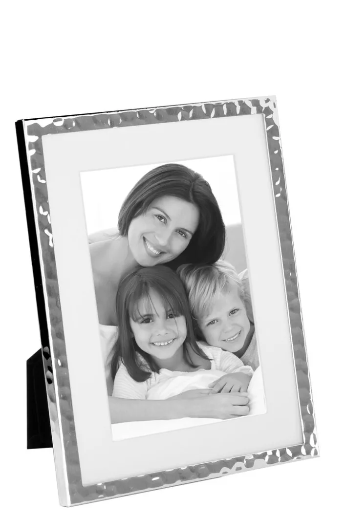 Der schmale, versilberte Rahmen wirkt, als wäre aus gehämmertem Silber gefertigt: Sanft bricht sich das Licht in den kleinen Flächen und zaubert punktuelles Leuchten rund um Ihr Foto. Für Ihre Liebsten ist das genau der richtige Rahmen! Selbstverständlich ist Ihr Lieblingsfoto hinter Glas geschützt. Der rechteckige Rahmen ist für Bildergrößen bis zu 10 cm x 15 cm geeignet und kann quer oder hochkant aufgestellt werden. Sie erhalten den Bilderrahmen in Ihrem porta! Online Shop in weiteren Ausführungen.
