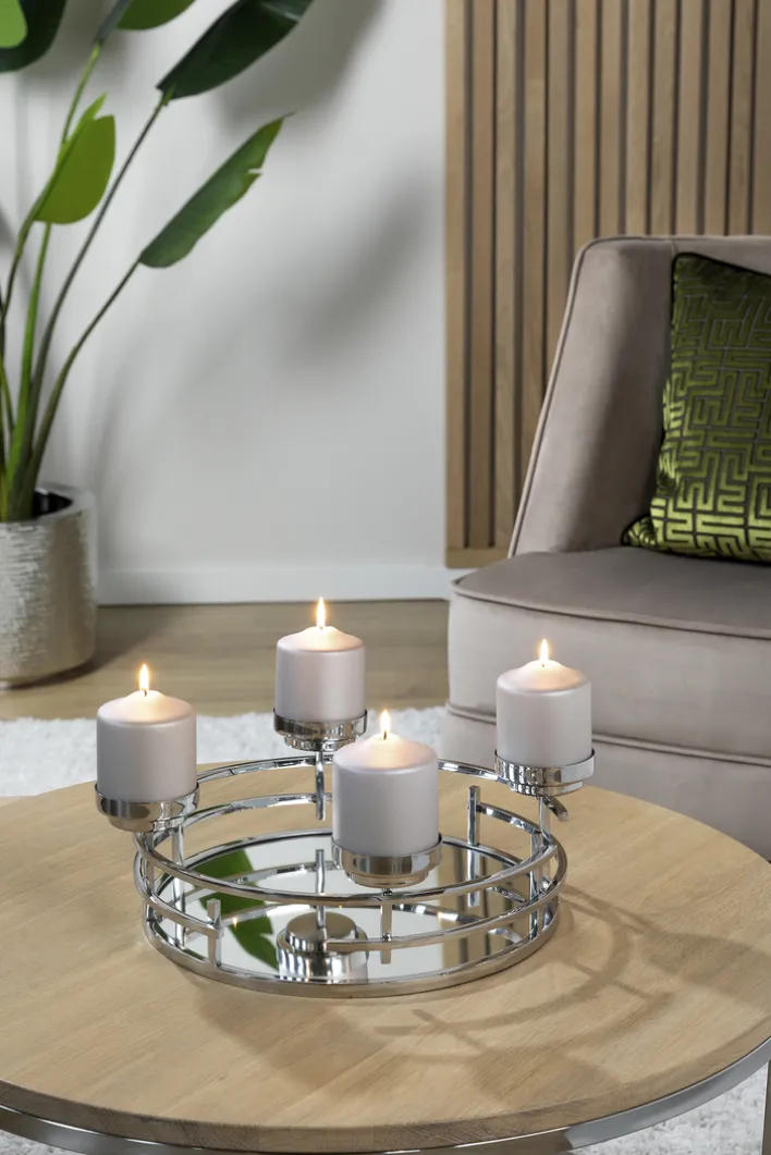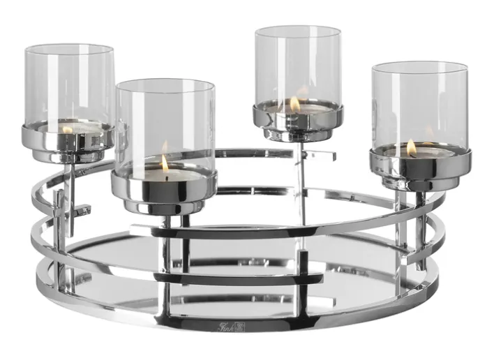 Der Kerzenständer der Serie ELISIO von Fink besticht durch sein elegantes und modernes Design. Gefertigt aus hochwertigem Glas und Metall, präsentiert sich der Kerzenhalter in einer silberfarbenen, vernickelten Oberfläche, die ihm einen zeitlosen Glanz verleiht. Mit einem Durchmesser von 42 cm und einer Höhe von 19,5 cm bietet er Platz für mehrere Kerzen, obwohl keine Kerzen im Lieferumfang enthalten sind.