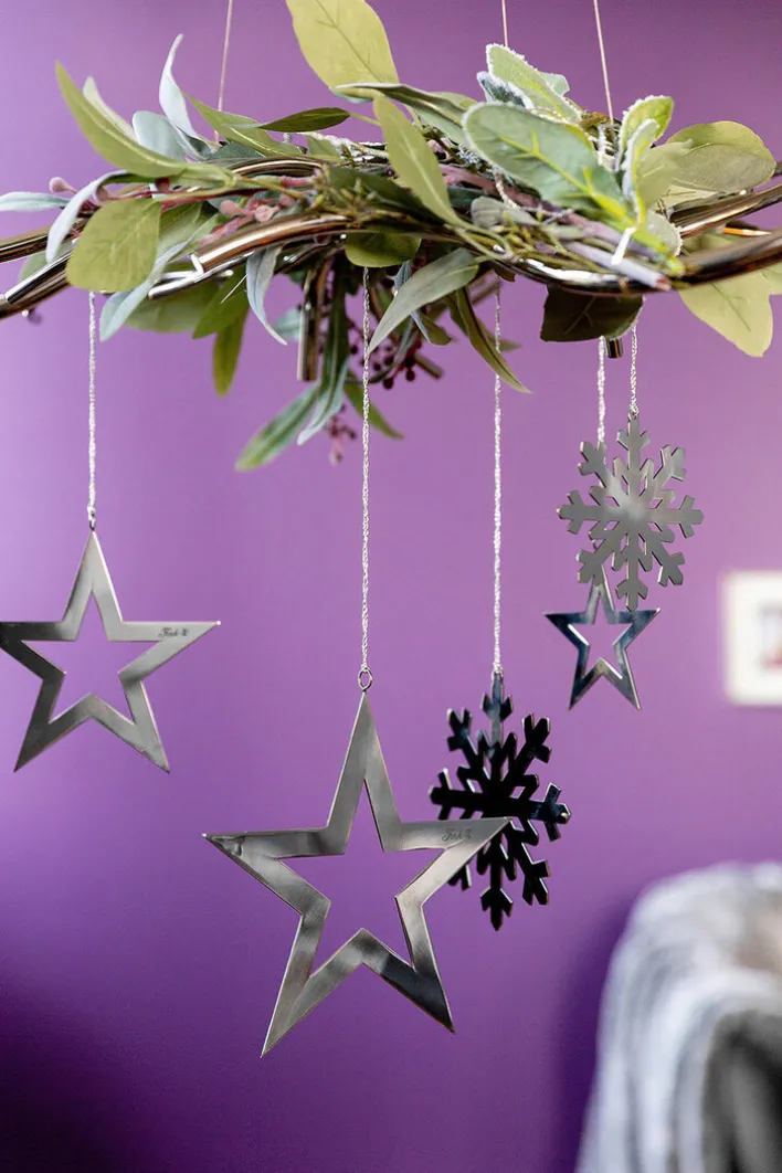 Hier kommt der Fink Weihnachtsbaumschmuck INSA. Der Stern ist 10,5 hoch und hat einen Durchmesser von 110 cm. Er ist aus silberfarbenem Edelstahl, ein Aufhänger ist inklusive.