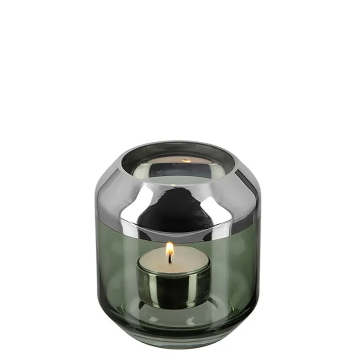 Das Fink Windlicht SMILLA in Dunkelgrün hat einen Durchmesser und eine Höhe von jeweils 9 cm. Der dezente Teelichthalter mit Silberrand beeindruckt durch ein elegantes Design und lässt sich vielseitig verwenden.
