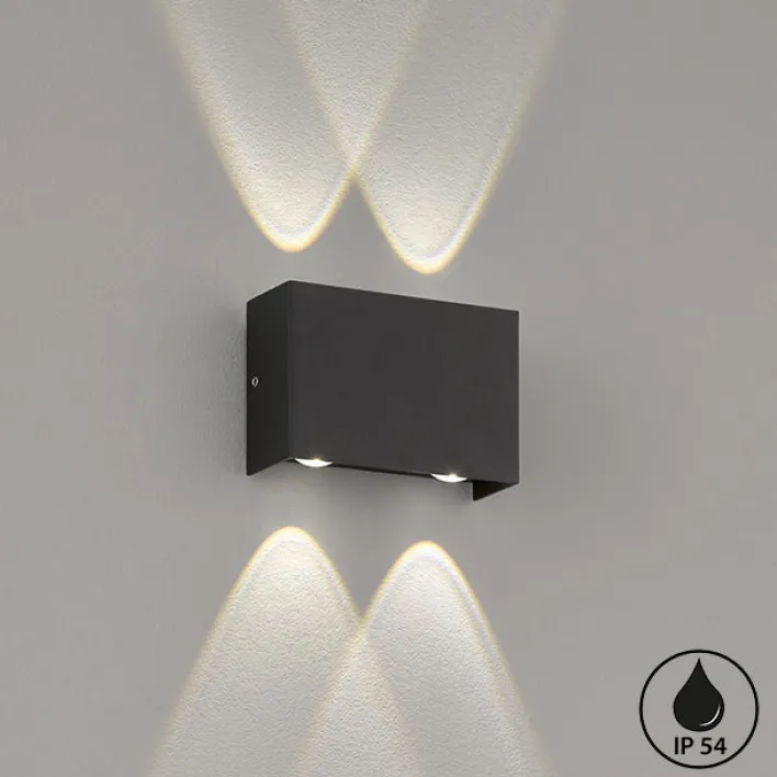 Die 10 Watt starke FISCHER & HONSEL LED Außenwandleuchte NAIROBI hat eine Bautiefe von 5 cm. Sie kann an der Hauswand im Eingangsbereich oder neben einer Garageneinfahrt installiert werden. Jeweils 2 LEDs strahlen die Fassade nach oben und unten an. Das erfolgt in Warmweiß und mit einer Lichtstärke von 4 × 240 Lumen. Dieses Modell entspricht der Schutzklasse 2 (IP54) und ist vor allseitigem Spritzwasser geschützt. Die Up and Down Lampe kommt mit fest eingebautem Leuchtmittel. Bis zu 20.000 Stunden Brenndauer sind möglich.