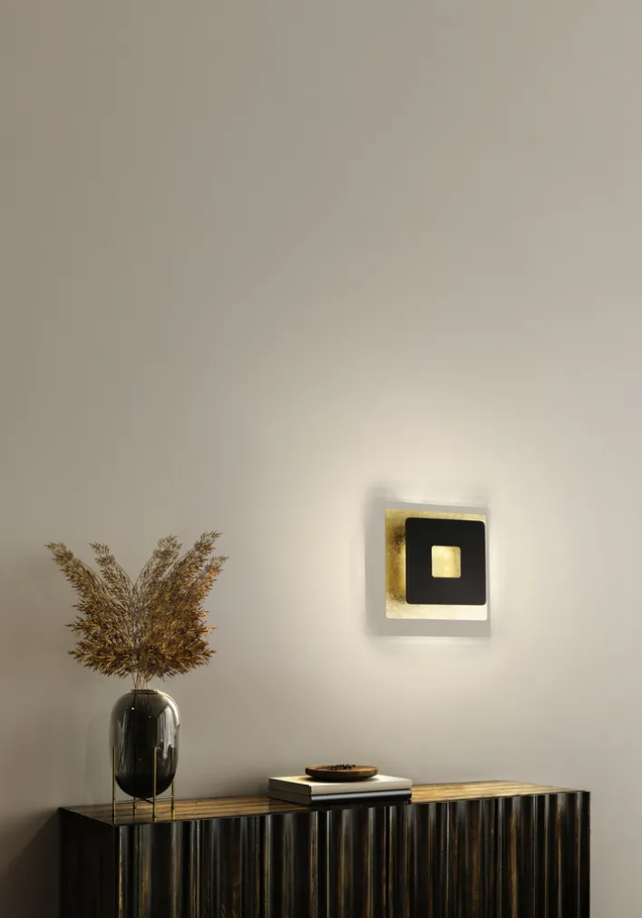 Die FISCHER & HONSEL LED Wandleuchte HENNES ist 18 breit und 18 hoch, bei einer Tiefe von 7,3 cm. Sie ist aus Metall in Sandschwarz mit blattgoldfarbenem Hintergrund.