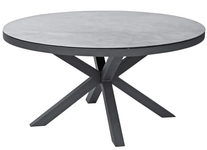 Der Gartentisch LEWIS aus Aluminium ist rund und hat einen Durchmesser von 150 cm. Der dreidimensionale Effekt der Tischplatte aus grauem Glas macht den massiven Tisch zu einem stilvollen Outdoor-Möbelstück.