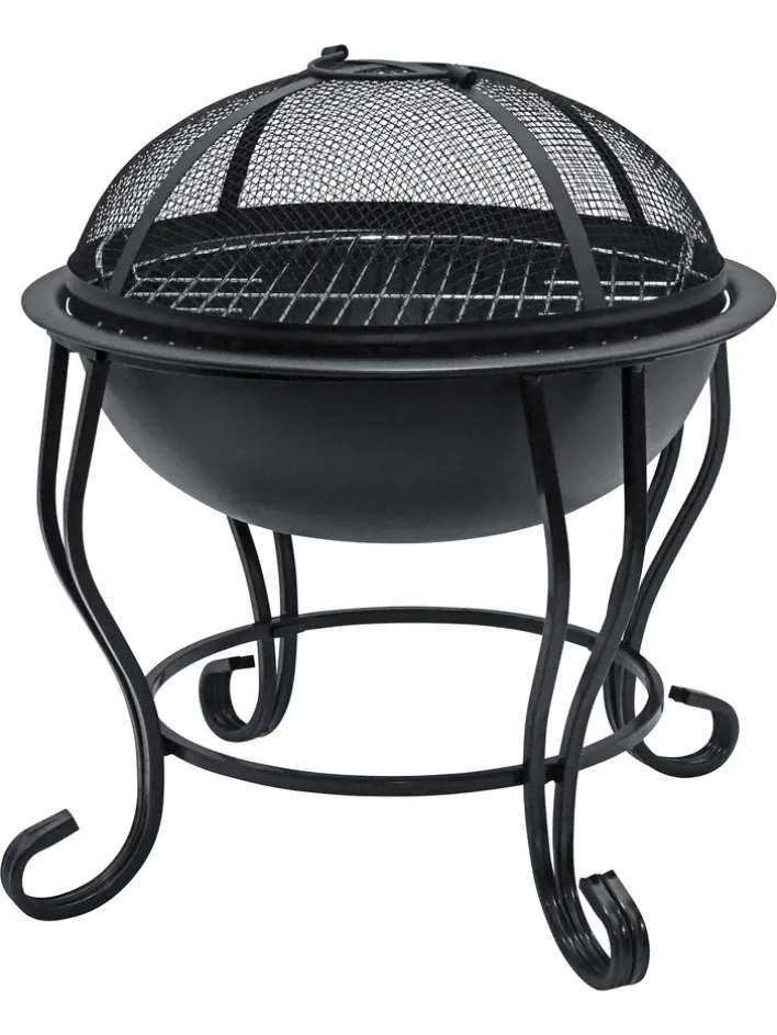 Die 5-teilige Garden FLAIR Feuerschale mit Funkenschutz hat eine Höhe von 54 cm und einen Durchmesser von 45 cm. Sie ist aus schwarz lackiertem Stahl, der Grillrost ist verchromt.