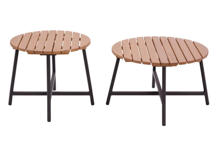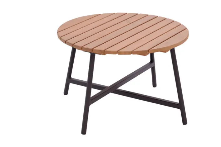 Das Gestell des Tisches besteht aus Aluminium in der Farbe Grau. Die funde geformte Tischfläche in lamellenoptik ist aus FSC recyceltem Teakholz gemacht und somit besonders nachhaltig produziert.
