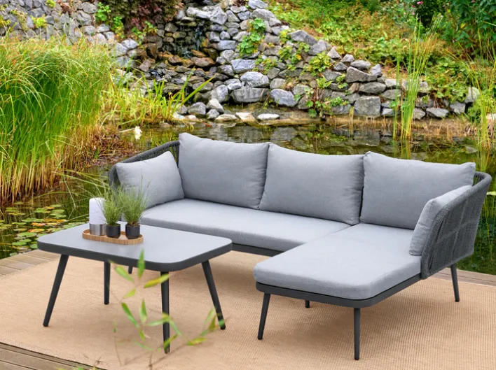 Die Gartenlounge besteht aus einem 2-Sitzer und einer Sitzbank in Form einer Ottomane rechts. Die Rückenlehne besteht aus einem seilartigen Kunststoffgeflecht in Grau und das Gestell aus hochwertigem Aluminium in Anthrazit. Die Sitzauflagen und Rückenpolster im textilen Bezug sind in einem hellen Stahlgrau gehalten. Die Platte des niedrigen Tisches ist aus Glas. Das Gartenloungeset macht dadurch einen freundlichen und erfrischenden Eindruck. Für kuschelige Stunden alleine, zu zweit oder für überraschenden Besuch! Das Design im Retro-Look besticht mit nostalgischen Flair!