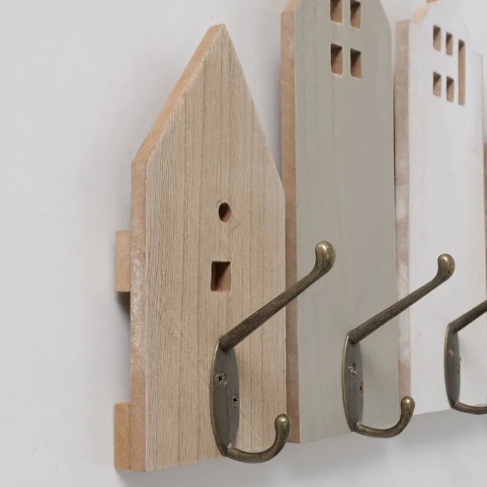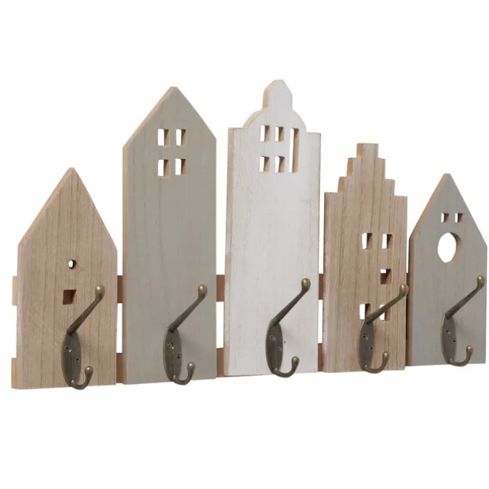 Die formschöne Garderobe GRONINGEN hat eine Breite von etwa 48 cm und ist eine dekorative Bereicherung für den modern eingerichteten Wohnbereich. An einer freien Wand in Dielen und Fluren kommt die mehrfarbige Garderobe mit Häusersilhouetten optimal zur Geltung und bietet zahlreiche Kombinationsmöglichkeiten mit bestehenden Einrichtungen. Fünf Doppelhaken aus stabilem Metall schaffen Platz für Jacken, Mäntel, Taschen und Schals. Die Garderobe sorgt für ein wohnliches Ambiente.