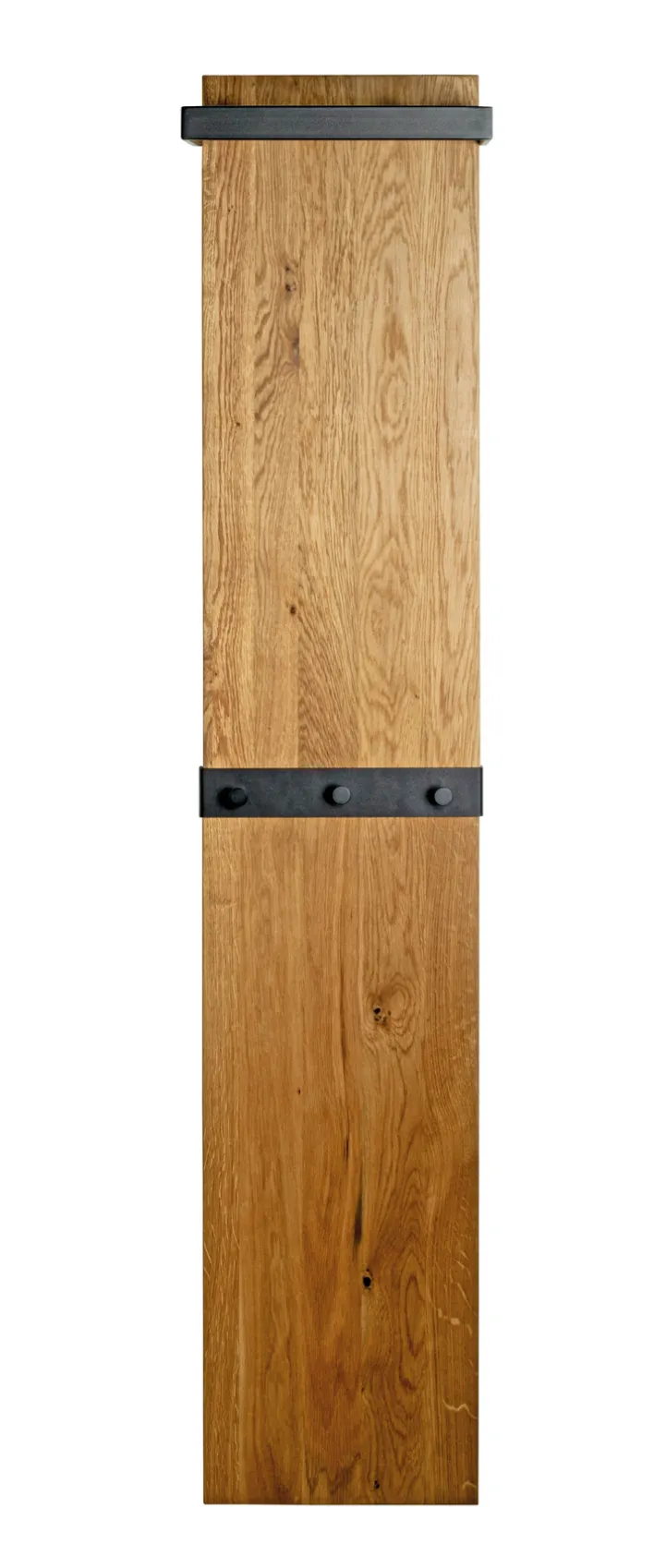 Das dekorative Garderobenpaneel besteht aus massiver Eiche und besitzt schwarzfarbige Akzente aus Metall. Es ist 175 cm hoch, 35 cm breit und 25 cm tief. Dank dieser Maße der Materialien fügt es sich hervorragend in bestehende Einrichtungen aus Eichenholz ein.