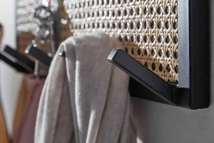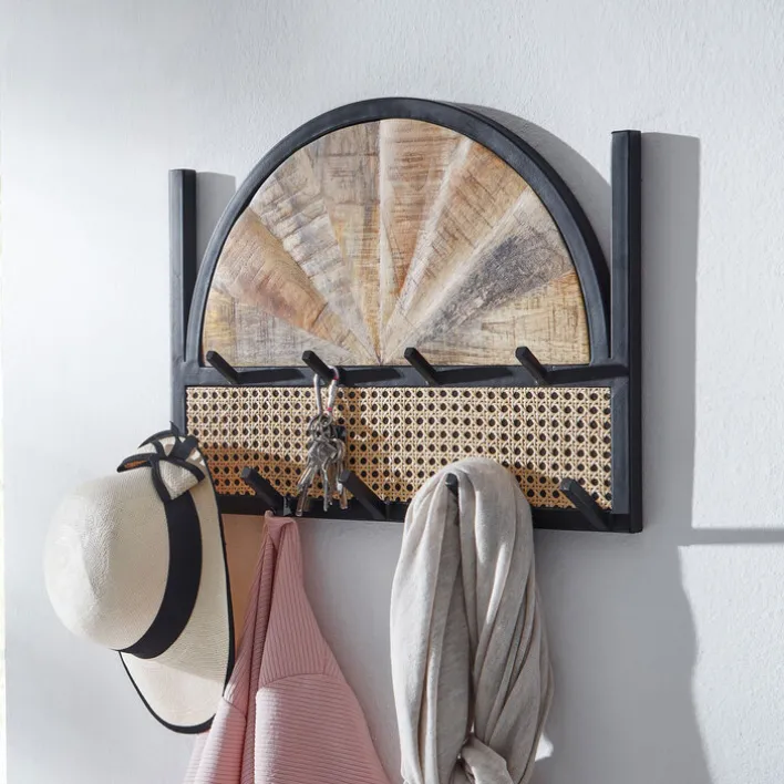 Das 53 x 40 cm große Garderobenpaneel Mango von verströmt fast schon orientalische Akzente in den heimischen vier Wänden – könnte aber genauso gut dem angesagten Bohemian-Style zugeordnet werden. Die rechteckige Form des Paneels wird durch das halbrunde Deko-Element in der Mitte geschickt durchbrochen, auch das Flechtmuster zwischen den Haken weckt Assoziationen an ferne Länder.